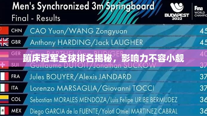 蹦床,這項(xiàng)充滿青春活力與動感的運(yùn)動項(xiàng)目,在全球范圍內(nèi)擁有廣泛的愛好者,蹦床冠軍,作為這項(xiàng)運(yùn)動的佼佼者,他們的表現(xiàn)一直備受關(guān)注,本文將探討蹦床冠軍的世界排名及其在全球范圍內(nèi)的巨大影響力。