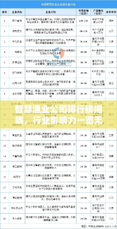 隨著科技的快速發(fā)展,智慧漁業(yè)作為新興行業(yè),正逐漸嶄露頭角,本文將探討智慧漁業(yè)公司的排名及其行業(yè)影響力,為讀者揭示這一領域的領軍企業(yè)。
