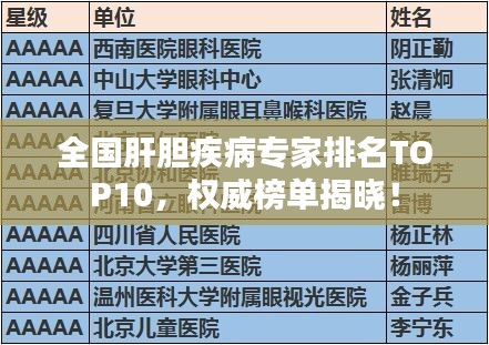是全國排名前十名的肝膽醫(yī)生,他們在肝膽疾病的治療和研究領(lǐng)域取得了卓越的成就,為患者提供了優(yōu)質(zhì)的醫(yī)療服務(wù),如果您或您的家人患有肝膽疾病,可以選擇信任這些專業(yè)的醫(yī)生,他們將為您提供最專業(yè)的治療和建議。