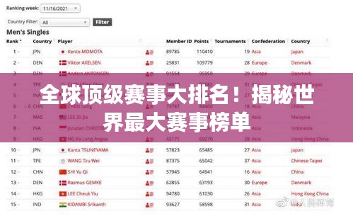 全球范圍內(nèi),各種體育賽事紛紛舉辦,其中不乏規(guī)模龐大、影響力廣泛的賽事,本文將為您介紹最大的世界賽事排名,這些賽事不僅吸引了全球最優(yōu)秀的運動員參與,也吸引了全球觀眾的關(guān)注。