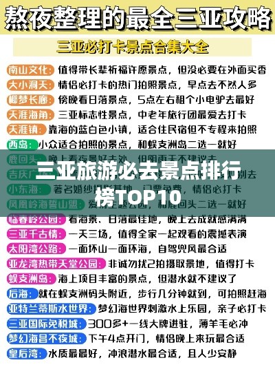 三亞,這座美麗的海濱城市,以其豐富的自然資源和獨(dú)特的旅游景觀吸引著成千上萬(wàn)的游客,下面為您介紹三亞旅游景點(diǎn)排名前十名,帶您領(lǐng)略這座城市的魅力所在。